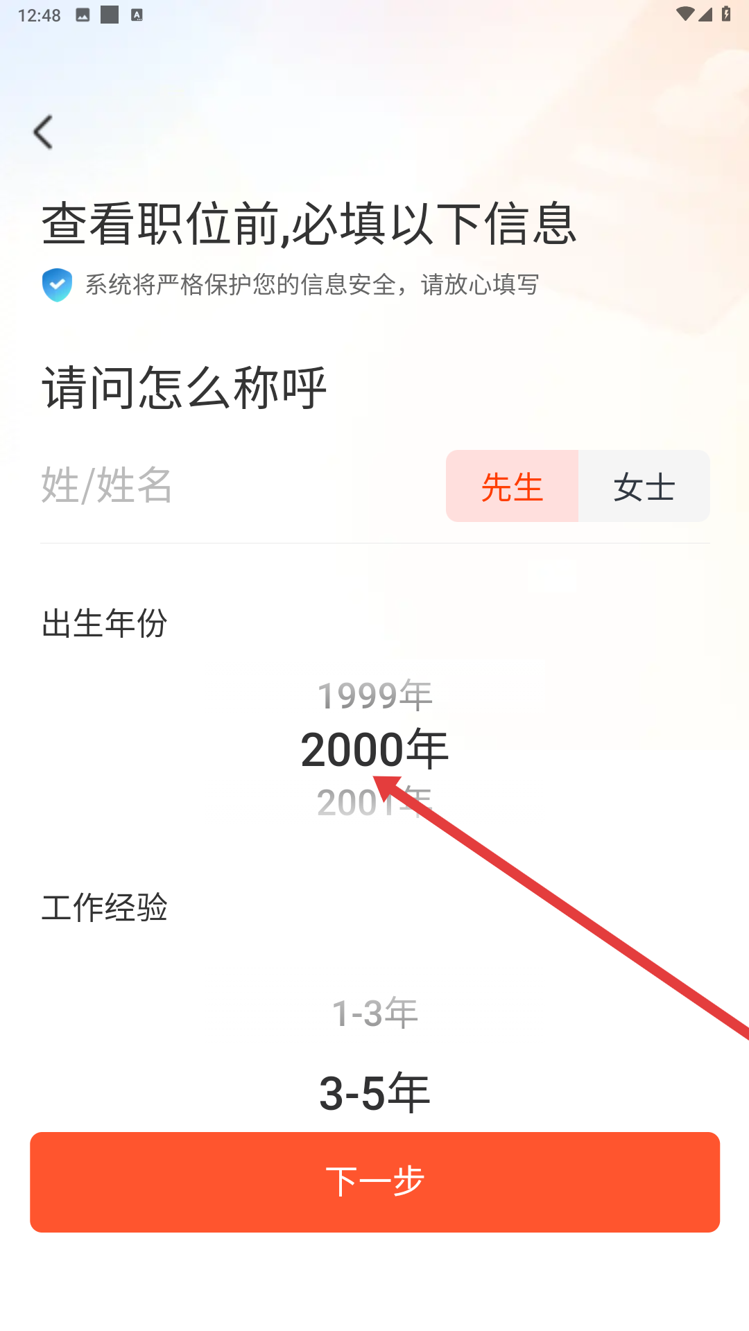 3、如何再信息填寫界面,依次填寫姓名、選擇出生年份、工作經驗等信息,點擊下一步。