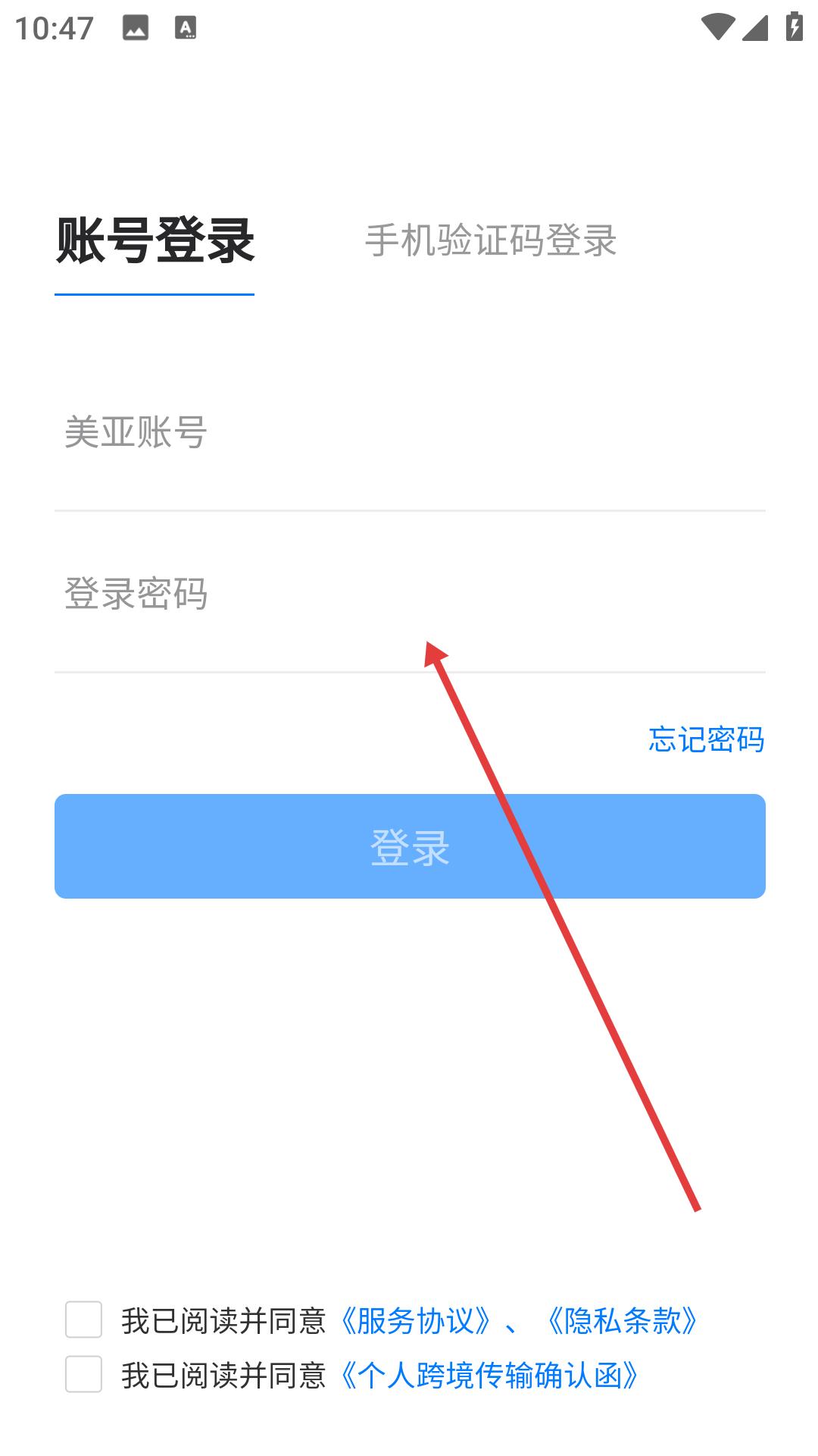2、在賬號登錄頁面,輸入美亞賬號和登錄密碼,勾選同意相關協議,點擊登錄按鈕即可進入應用。