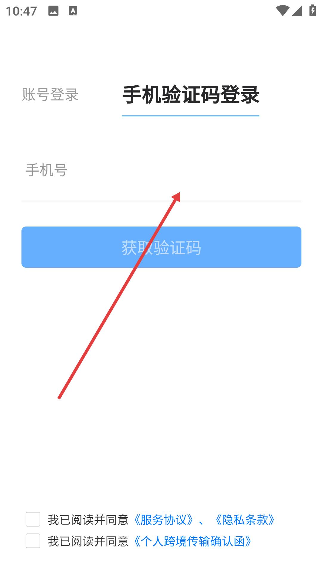 3、選擇手機驗證碼登錄時,輸入手機號,獲取驗證碼,勾選同意相關協議,完成登錄操作。