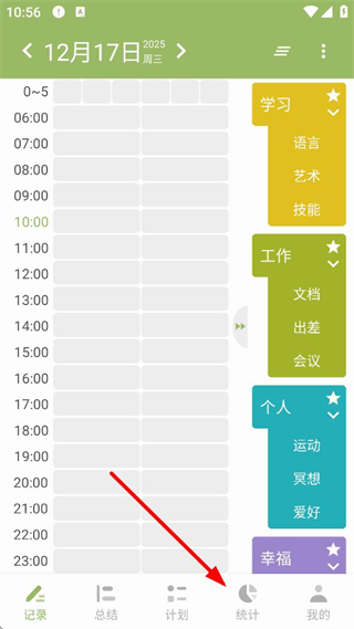 1、進入塊時間的記錄頁面,可見當日時間日程表及學習、工作等分類板塊,點擊底部統計按鈕,可進入時間統計頁面查看時間使用情況。