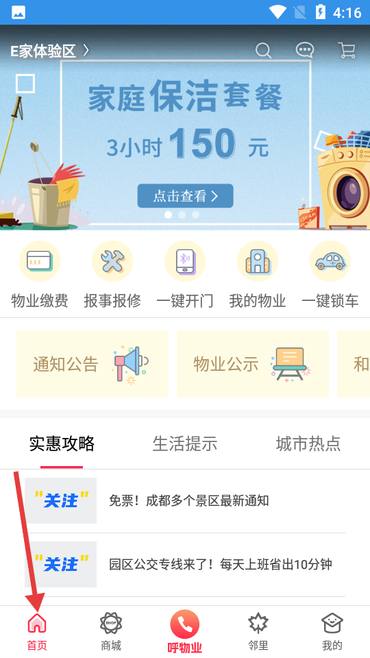 1、首頁主推家庭保潔套餐,集成物業繳費等便捷功能,發布通知公告,推送實惠攻略等資訊服務居家生活。