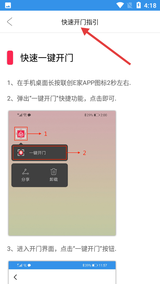 2、快速開門指引頁詳細講解快速一鍵開門方法,通過手機桌面快捷操作實現,為用戶提供高效的開門指引。