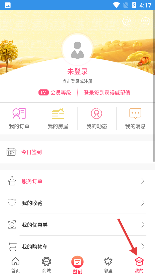 4、我的頁面提示未登錄,可進行登錄注冊,聚合我的訂單等個人板塊,還有簽到功能,便于用戶管理個人信息與服務訂單。
