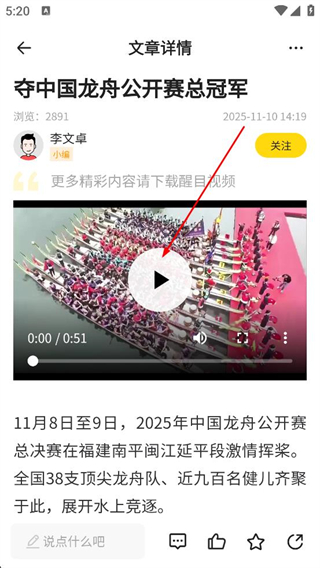 1、在首頁可看到熱門資訊,找到感興趣的資訊如五冠加冕,順德樂從龍舟隊勇奪中國龍舟公開賽總冠軍,點擊即可進入文章詳情頁面。