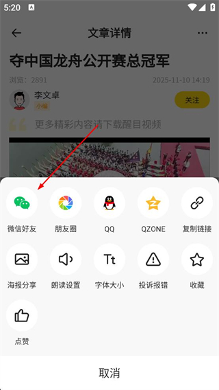 3、在文章詳情頁面點擊分享選項可選擇微信好友、朋友圈、QQ等分享方式,將文章分享給他人。