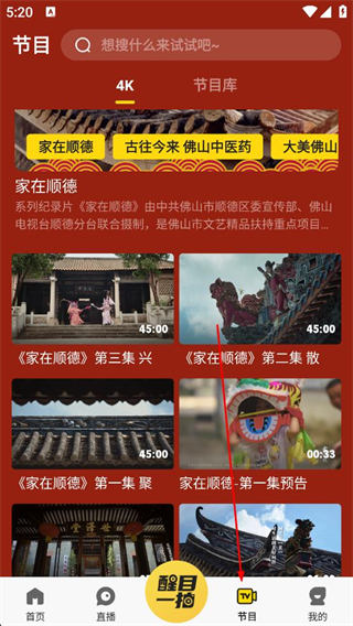 4、點擊底部節目選項進入節目頁面,可看到家在順德等系列紀錄片,選擇感興趣的節目即可觀看。