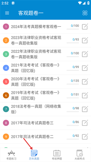1、這是法考備考App的歷年真題模塊,提供2017-2024年客觀題真題卷,支持按年份選卷練習,助力熟悉真題規律。