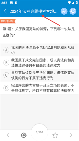2、真題練習界面展示法考單選題,覆蓋憲法等核心科目,支持逐題作答,適配碎片化刷題的備考場景。