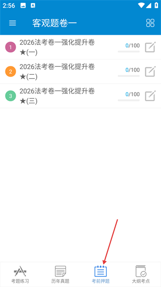 3、點擊考前押題板塊,有2025法考卷一考前押題和強化練習卷,如押題1及強化練習卷一等,助力備考沖刺。