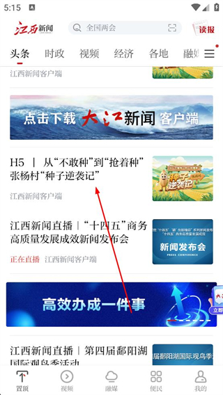 1、打開江西新聞APP,進入首頁可看到頭條、點擊感興趣的新聞,如從不敢種到搶著種張楊村種子逆襲記,進入新聞詳情頁面。