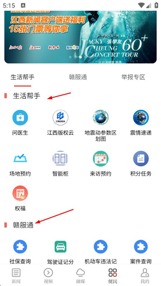 4、進入便民頁面可看到生活幫手和贛服通板塊,生活幫手有問醫生、江西版權云等功能,贛服通有社保查詢、駕駛證記分等服務,根據需求使用相應功能。