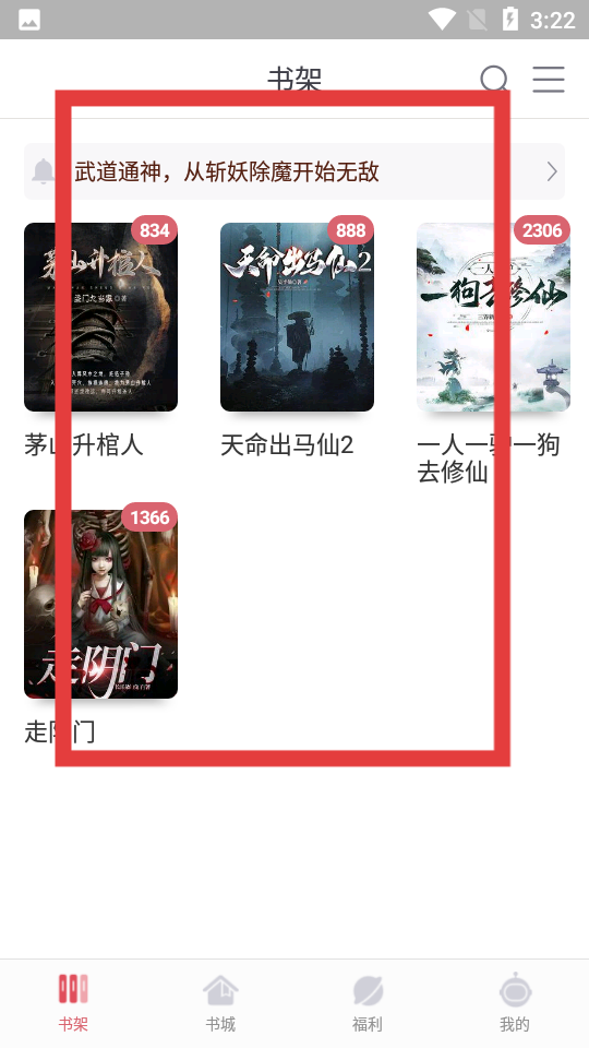 2、進入書架界面,可查看已添加的書籍,如茅山升棺人等,點擊書籍即可開始閱讀,管理自己的閱讀列表。