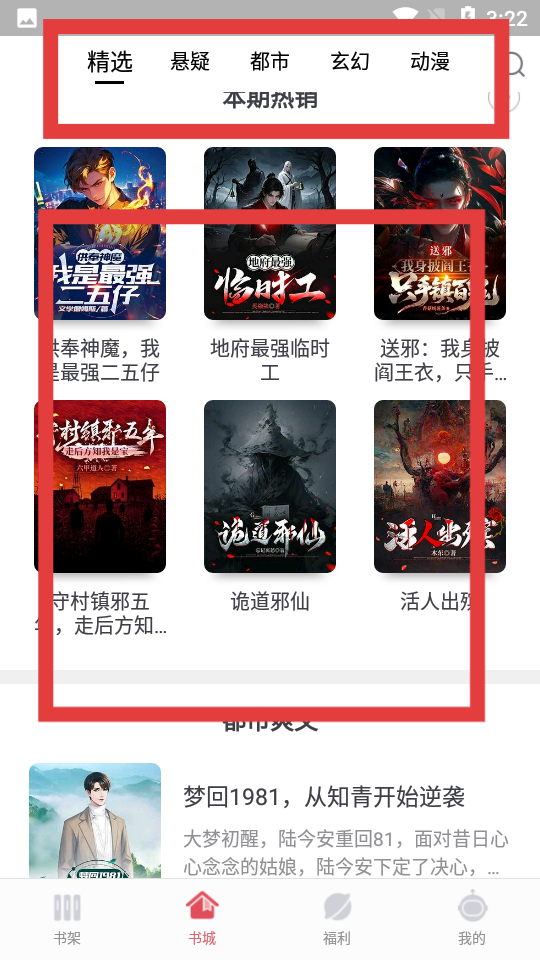 3、在書城的分類界面,選擇精選、懸疑等分類,瀏覽本期熱詞推薦的書籍,找到喜歡的書籍進行閱讀。