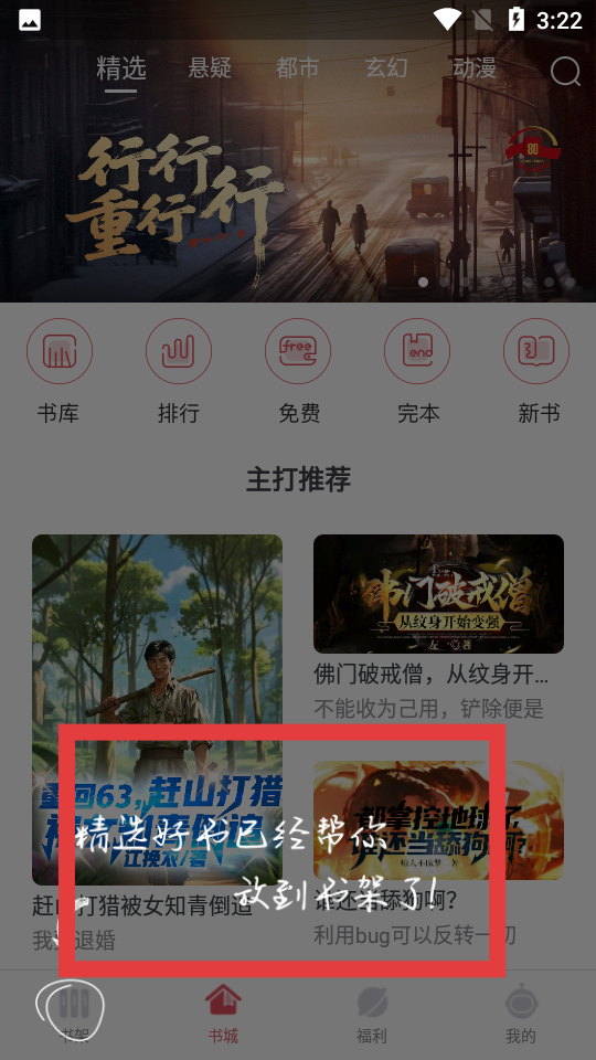 1、在書城界面,可查看精選、懸疑等分類,還有書庫、排行等功能入口,挑選感興趣的書籍,加入書架方便閱讀。