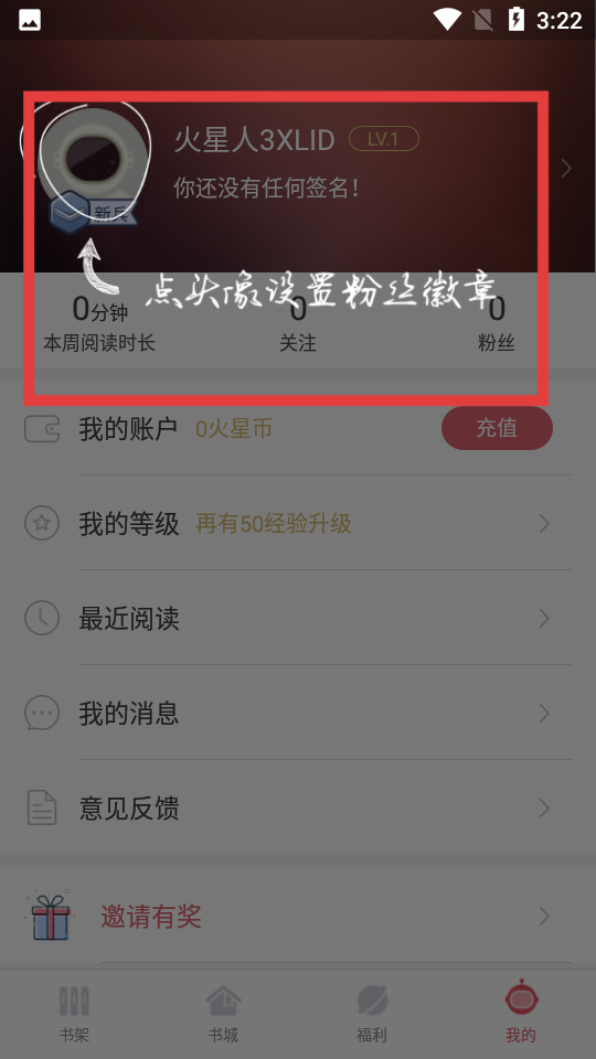 4、在我的界面,點擊頭像可設置粉絲徽章,查看本周閱讀時長、關注和粉絲數量,管理個人賬號信息。