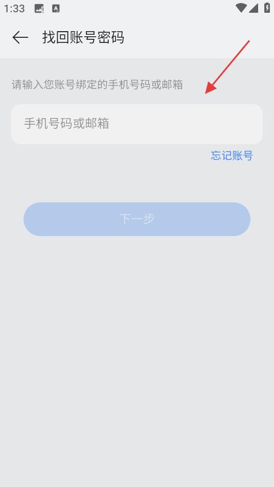 4、找回賬號密碼頁面,需輸入賬號綁定的手機號碼或郵箱,若忘記賬號也有對應入口,輸入后可點擊下一步繼續操作。