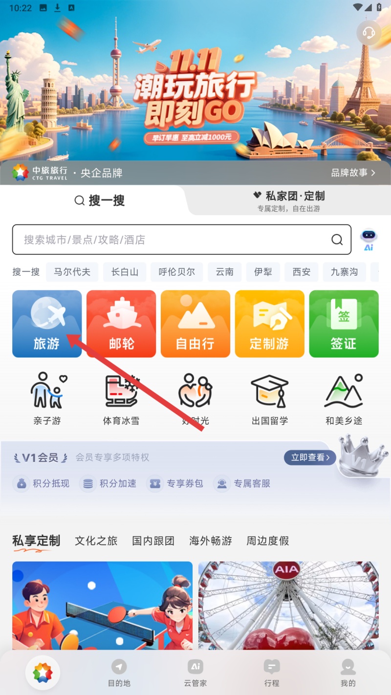 1、進入首頁,可使用旅游、郵輪、自由行等功能,搜索城市、景點等信息,還能查看私享定制、文化之旅等旅行推薦。