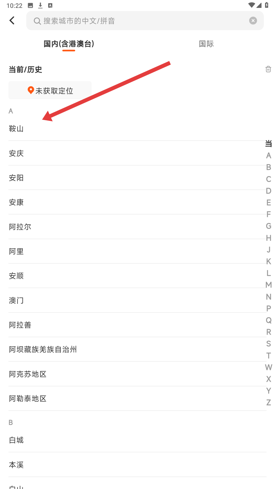 4、選擇出發地或目的地時,可國內含港澳臺城市列表中選擇,如鞍山、安慶等,也可搜索城市中文或拼音,規劃旅行行程。