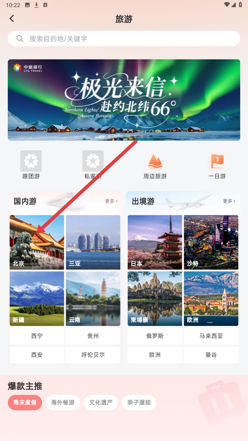 2、點擊旅游功能,進入旅游頁面,可選擇跟團游、私家游等類型,查看國內游如北京、三亞和出境游如日本、沙特等目的地推薦。