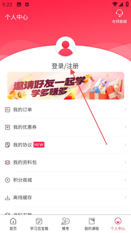 2、個人中心界面,有我的訂單、我的優惠券等功能入口,還有邀請好友一起學的活動,方便用戶管理個人信息和參與活動。