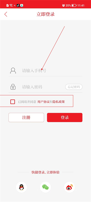 1、打開軟件進入立即登錄頁面,點擊手機號輸入框填寫號碼,再輸入密碼,勾選已閱讀并同意相關協議,選擇登錄按鈕完成賬號登錄。