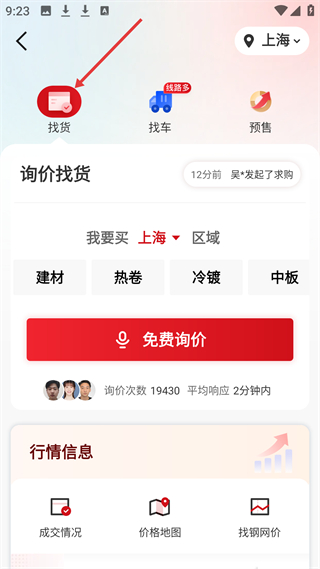 2、找貨頁可對建材、熱卷等鋼材詢價,以上海為例提供免費詢價,平均響應2分鐘內,還有成交情況等行情信息入口。