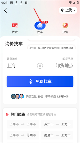 3、找車頁可查上海到各地貨運線路,提供免費找車,平均響應1.5分鐘內,展示上海到蘇州等熱門線路。