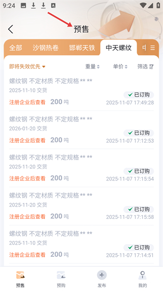 4、預售頁展示沙鋼熱卷、中天螺紋等鋼材預售信息,注冊企業后可查詳情,支持按重量、單價排序篩選。