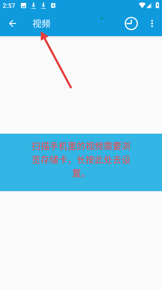 1、點擊視頻頁面,頂部標注視頻,提示長按可設置以掃描手機視頻,需瀏覽存儲卡來操作。