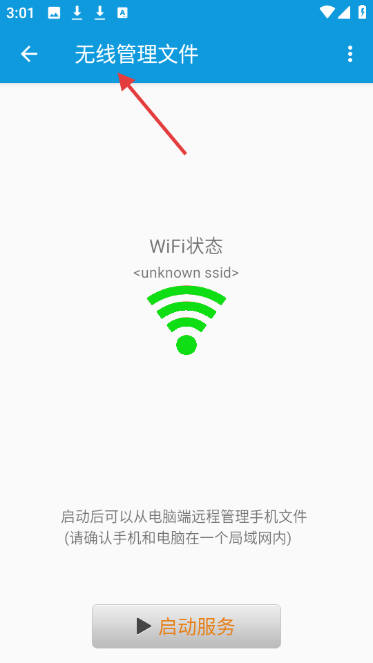 2、無線管理文件頁面顯示WiFi狀態,可啟動服務從電腦端遠程管理手機文件,前提是處于同一局域網。
