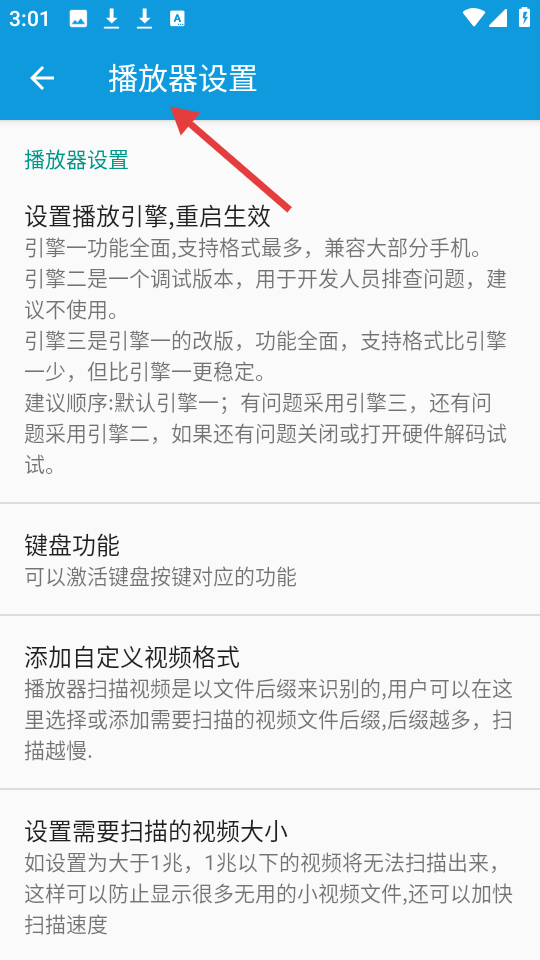 3、播放器設置詳細介紹播放引擎等設置功能,還涉及鍵盤功能、自定義視頻格式與掃描視頻大小設置。