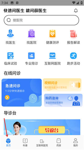 1、首頁,涵蓋找醫生、找醫院、健康測評等功能,在線問診板塊提供急速問診、視頻問診、購藥咨詢服務,底部設首頁、科普等導航欄,便于切換不同功能板塊。