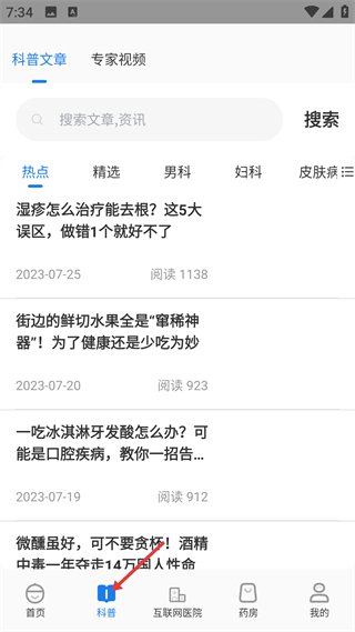 2、切換到科普頁面,分科普文章、專家視頻板塊,支持搜索健康資訊,設熱點、精選等分類,展示各類健康相關文章,助力了解健康知識、規避健康誤區。