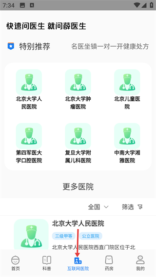3、進入互聯網醫院頁面,展示特別推薦的知名醫院,支持查看更多醫院并篩選,提供名醫一對一開健康處方的服務,可對接不同等級的公立醫院資源。