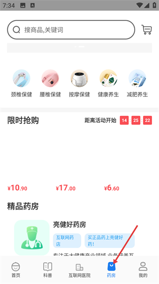 4、切換到藥房頁面,頂部設商品搜索欄,含頸椎保健等健康分類,有限時搶購活動區域,還有精品藥房板塊展示如亮健好藥房等渠道,可獲取健康相關商品。