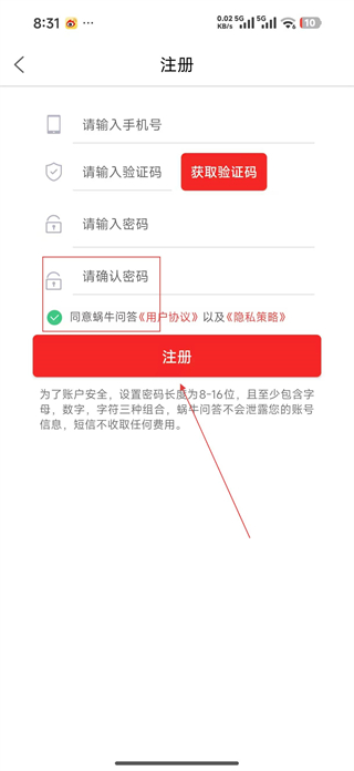 4、輸入手機號獲取并填寫驗證碼,設置并確認密碼,勾選相關協議,點擊注冊按鈕完成賬號注冊。