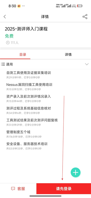 2、在課程詳情頁面查看課程目錄及相關內容,點擊請先登錄按鈕,進入登錄界面,準備完成賬號登錄以學習該課程。