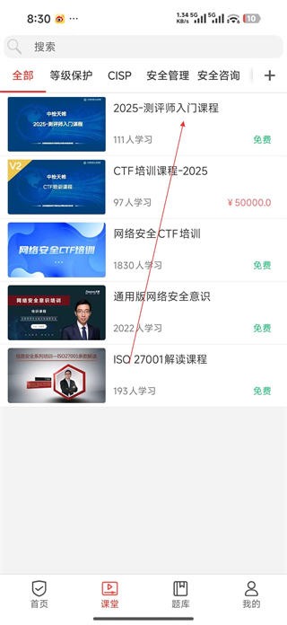 1、打開蝸牛問答軟件,進入課堂頁面,可看到各類課程列表,選擇目標課程條目,比如2025測評師入門課程,點擊進入課程詳情頁面。