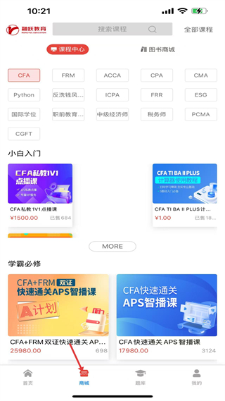4、商城分課程中心與圖書商城,課程覆蓋多類財經考試,按維度分類,支持課程搜索與購買操作。