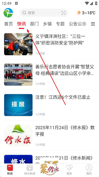 1、打開軟件進入首頁,切換至快訊板塊,瀏覽寧義鎮善樂行等資訊內容,查看不同分類下的新聞動態及公告信息。