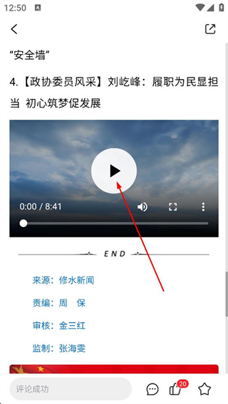 3、在新聞詳情頁點擊視頻播放按鈕,觀看政協委員風采等內容,查看視頻的來源及責編等信息,了解新聞詳情。