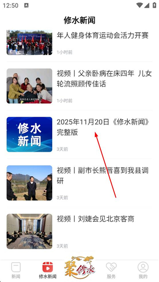 2、進入修水新聞頁面查看老年人運動會兒女照顧父親等新聞,選擇2025年11月20日修水新聞完整版,進入新聞詳情頁。