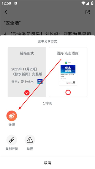4、點擊分享按鈕選擇鏈接形式或圖片方式,再選擇微博渠道完成分享,最后點擊取消關閉彈窗。