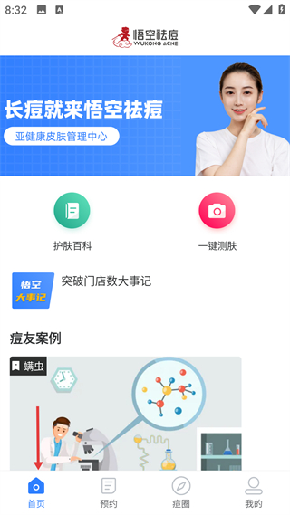 1、首頁,看到長痘痘就來悟空祛痘的宣傳語,設有護膚百科、一鍵測膚功能入口,還有痘友案例板塊,底部配備首頁、預約等導航按鈕,助力痘肌護理相關操作。