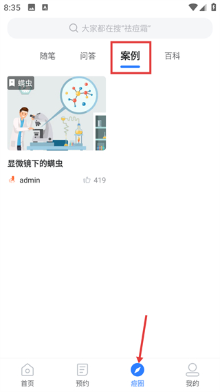 2、痘圈的案例頁面,頂部有搜索欄,分類標簽里案例為當前選中項,展示了顯微鏡下的螨蟲相關內容,還能看到該內容的點贊數,底部“痘圈”按鈕是當前頁面的入口。