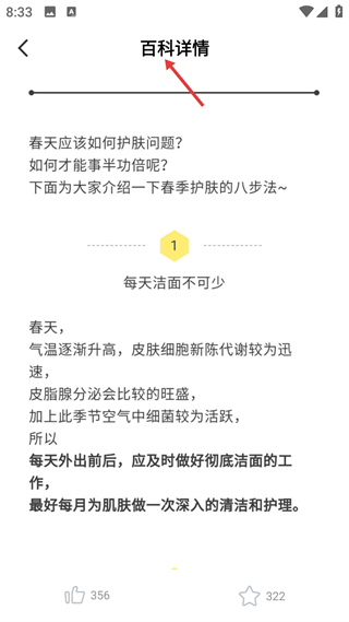4、百科詳情頁面,標題為百科詳情,圍繞春天如何護膚展開,講解春季護膚八步法的第一步每天潔面不可少,說明春季潔面的原因及護理建議,內容有點贊和收藏數。
