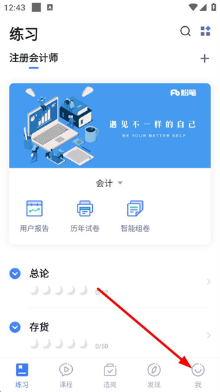 1、進入粉筆練習頁面,可選擇注冊會計師等備考方向,使用用戶報告、歷年試卷、智能組卷等功能輔助學習,點擊底部進入我個人相關頁面。