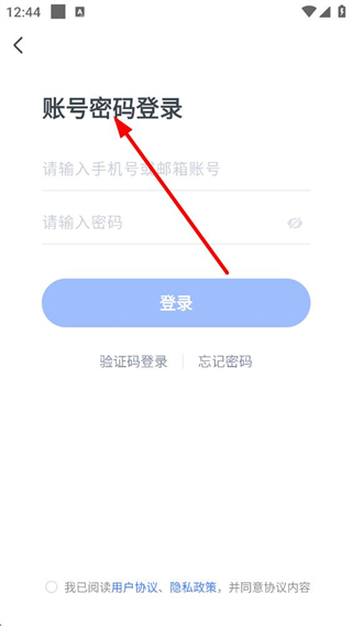 4、進入賬號密碼登錄頁面,輸入手機號、郵箱賬號及對應密碼,勾選相關協議后點擊登錄,若忘記密碼可選擇對應選項找回。