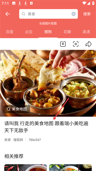 4、美食圖片詳情頁,展示行走的美食地圖圖片,顯示來源尺寸,有下載識圖分享功能,還有相關推薦。