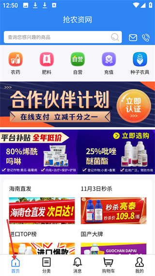 1、首頁板塊,名為搶農資網,有農藥、肥料等功能入口,開展合作伙伴計劃與平臺補貼活動,展示海南直發、秒殺等農資分類。